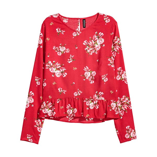 Long-sleeved blouse in a viscose weave with an opening with a button at the back of the neck and a flounce at the hem. Slightly longer at the back.